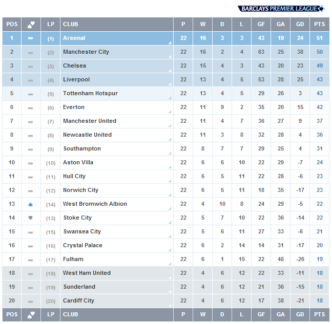 • Na parte de baixo da tabela, apenas um ponto separam o lanterna Cardiff do Fulham, primeiro fora da zona de rebaixamento. O Aston Villa, décimo colocado, está a seis pontos do West Ham, que é o primeiro do "z4 Inglês". E por faltarem consideráveis 16 rodadas, tudo pode acontecer.